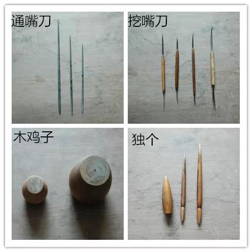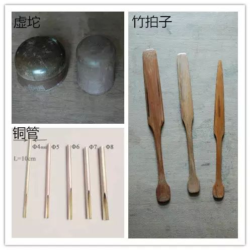 挖嘴刀,用于挖嘴孔内壁;铜管,用于钻眼孔挖嘴刀是用来挖嘴洞的,为2~3毫米粗的钢丝烧红后加柄制成的。铜管则是钻各种大小洞眼用的,大小各异。