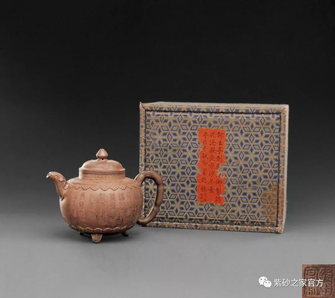 清乾隆 邵玉亭制紫泥泥绘御制诗文荷塘三足壶