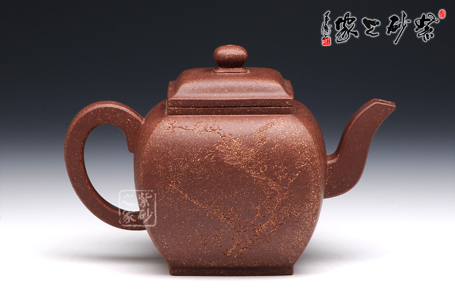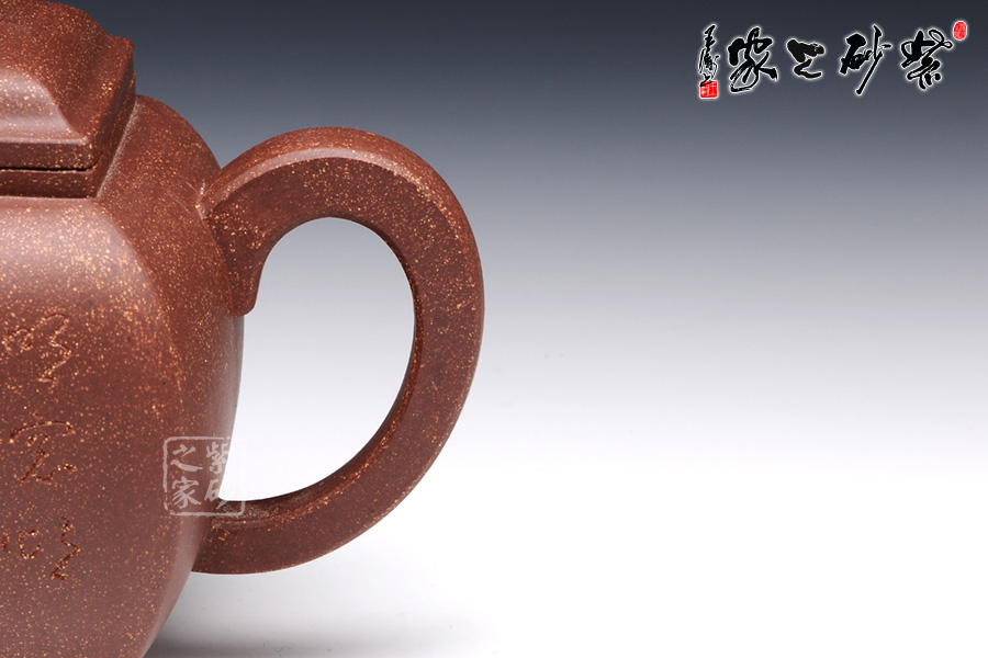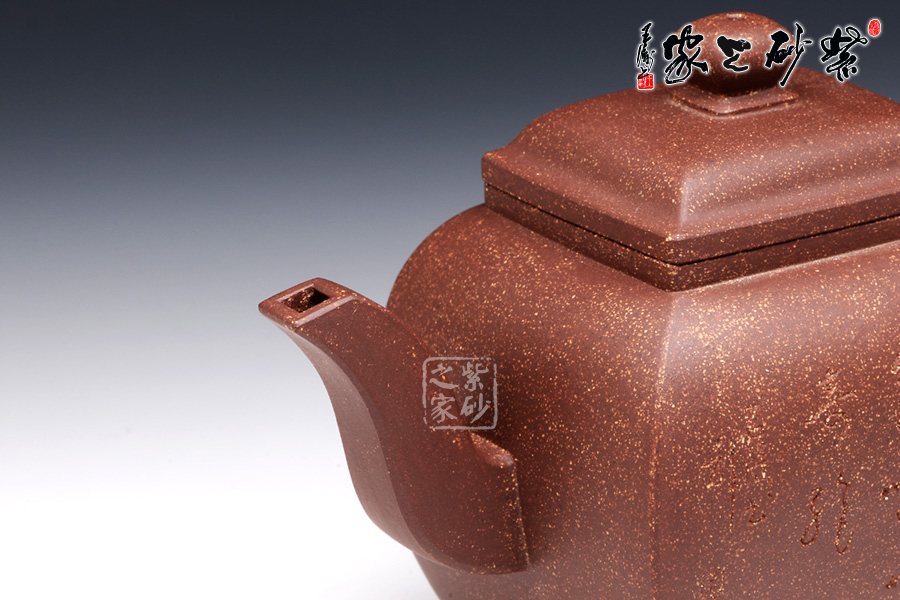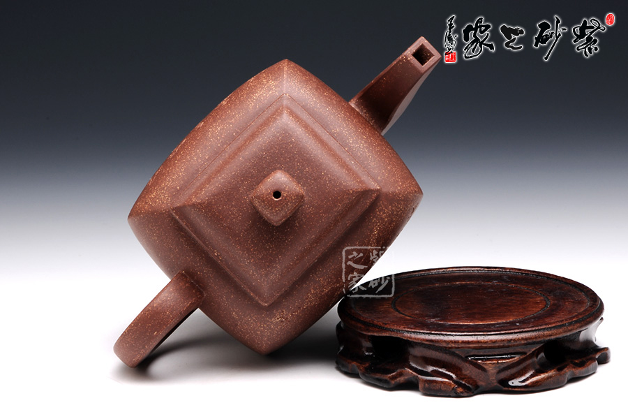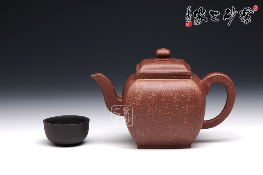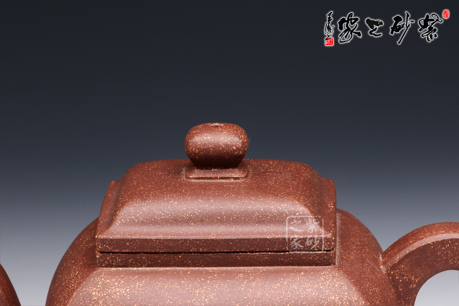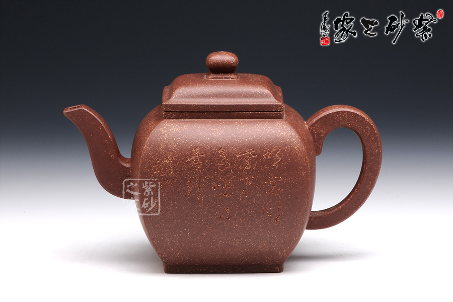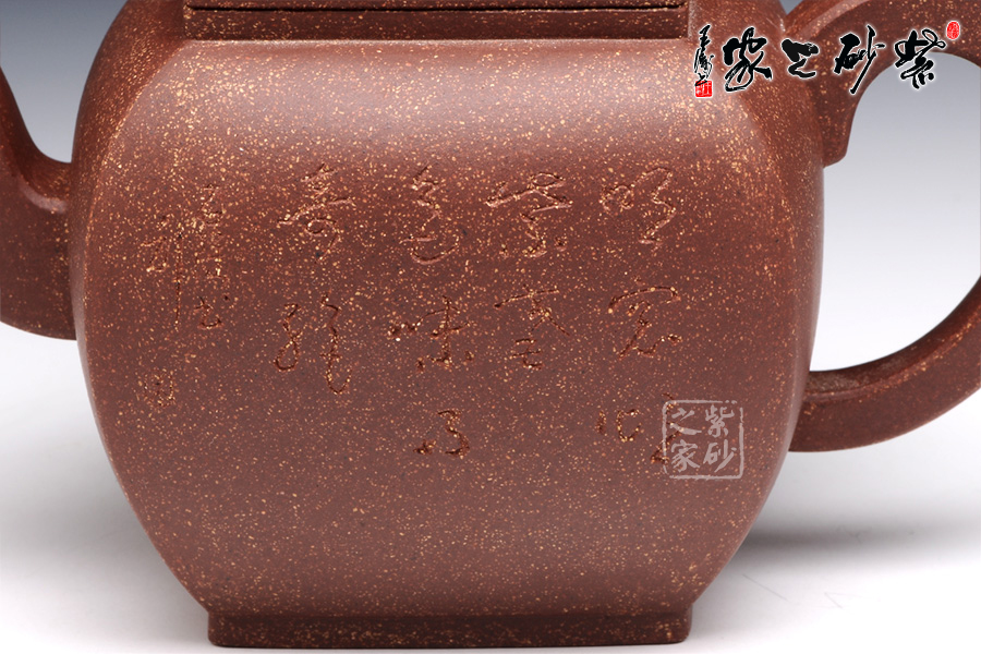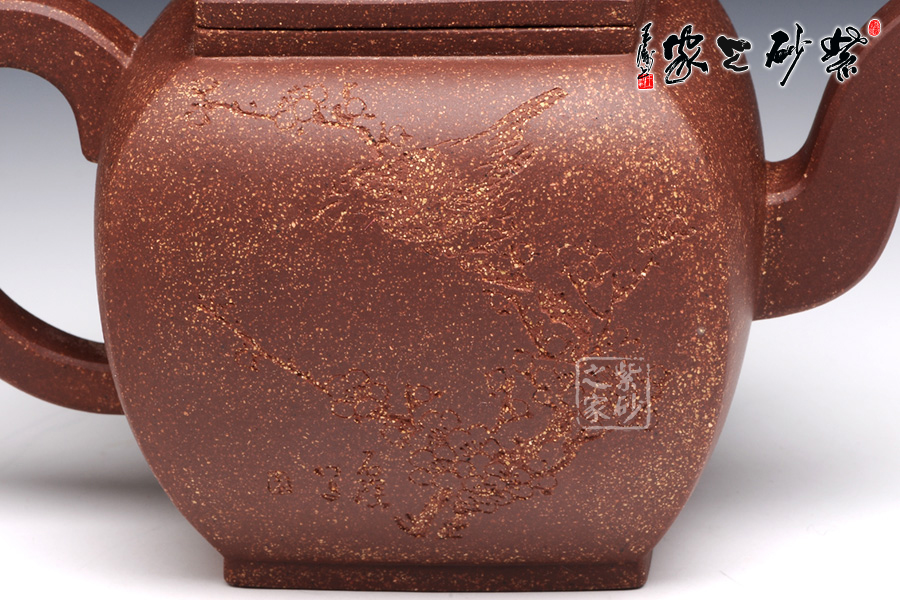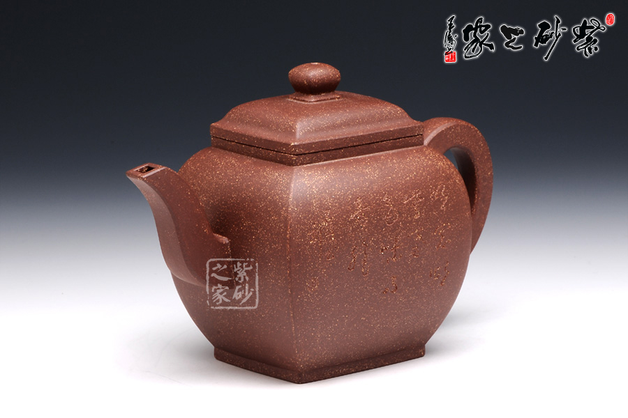 此壶作品具有挺劲阳刚之气,含浑厚大度之势,承袭传统。该四方壶,高挺大气,气宇轩昂,端庄古朴。壶钮和壶身和谐一致,仿若一大一小的壶体,构思精妙,比例协调。壶嘴三弯流,出水迅猛爽利,壶把俊郎有力,端握舒适。方圆结合的乳足,更增添了该壶的挺阔之气,紫泥的温润中又带有金砂小颗粒的砂质,更增添了此壶的古雅醇厚之味,该壶是实用和把玩的佳品,不可错过。